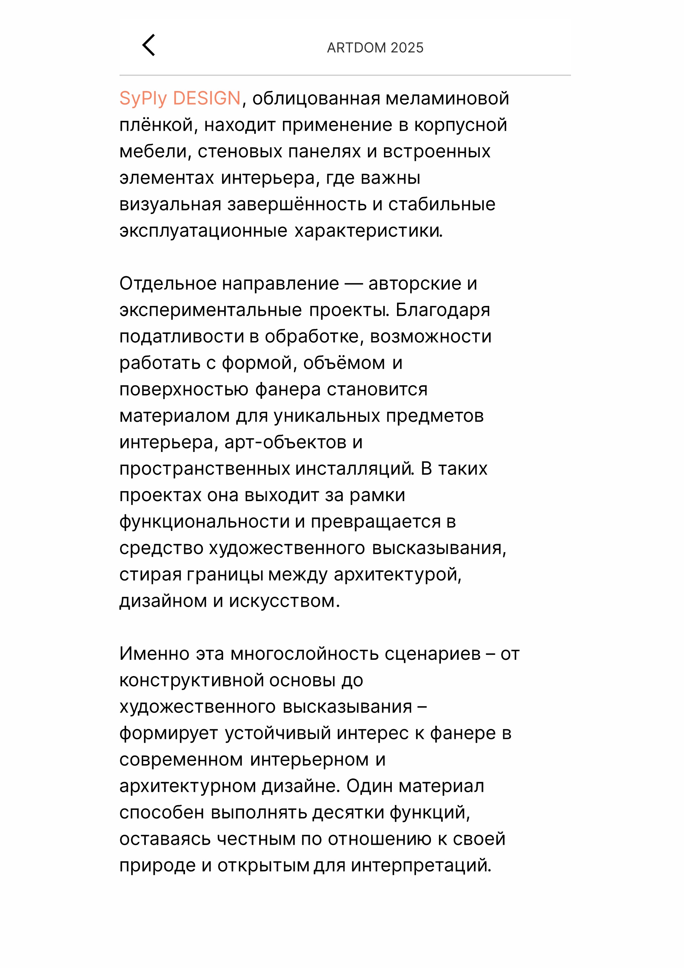 Ассортимент берёзовой фанеры SyPly иллюстрирует этот подход на практике: разные сортности и форматы материала применяются в стеновых и потолочных панелях, перегородках, мебели, лестницах и подиумах, а также в общественных и выставочных пространствах. Отдельное направление — авторские и экспериментальные проекты, где фанера становится инструментом работы с формой, объёмом и художественным образом.